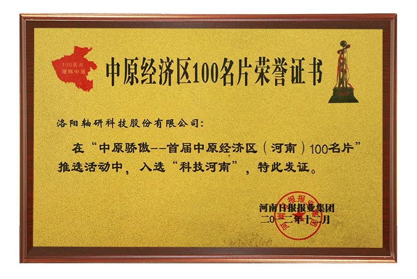 中原經(jīng)濟區(qū)100名片證書