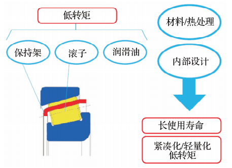 通過材料、熱處理、內部設計參數的變化以及諸如密封、保持架、潤滑脂的改進(圖1),實現低轉矩的要求和緊湊化、輕量化的設計。