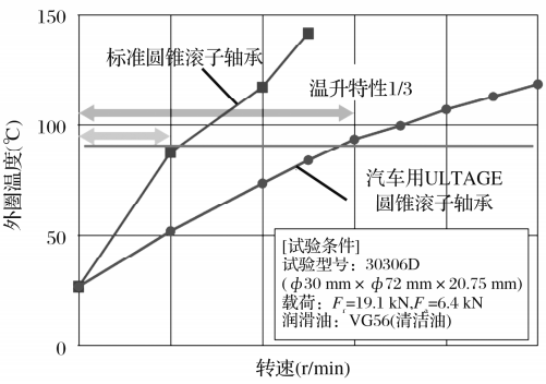 在溫升試驗中,其溫升為標準軸承的1/3,證實了其優(yōu)越的卡死抗力,如圖10所示。如圖7所示,優(yōu)化了擋邊和滾子端面形狀,得到了優(yōu)越的卡死抗力。
